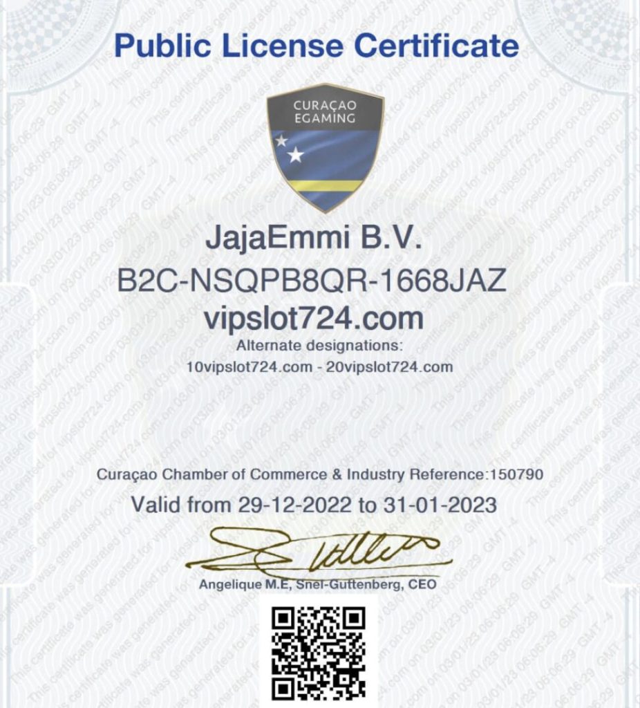 Vipslot, Curacao Lisans Denetleme Kurulu tarafından License No. 1668/JAZ lisans numarasıyla yetkilendirilmiş ve resmi olarak lisanslandırılmış bir platformdur. Lisans, sitenin yasal olarak faaliyet göstermesini sağlar ve kullanıcılar için güvenli bir oyun ortamı sunar. Lisanslı olması, adil oyun ve ödeme süreçlerinin denetlendiğinin göstergesidir.